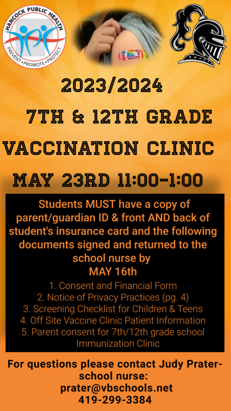 A vaccination clinic for 7th and 12th grade students will be held on May 23 from 11:00 AM to 1:00 PM. Students must have a copy of their parent/guardian's ID and the back of the student's insurance card. The following documents must also be signed and returned to the school nurse by May 16: