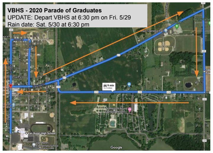 Our parade of graduates will leave VBHS at 6:30 pm on Friday, May 29th (Rain date: Saturday, 6:30 pm). We welcome the entire community to come and show their support of the Van Buren High School Class of 2020.